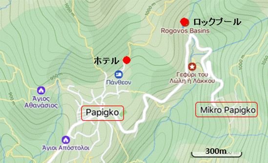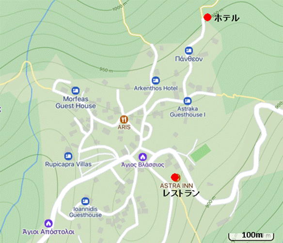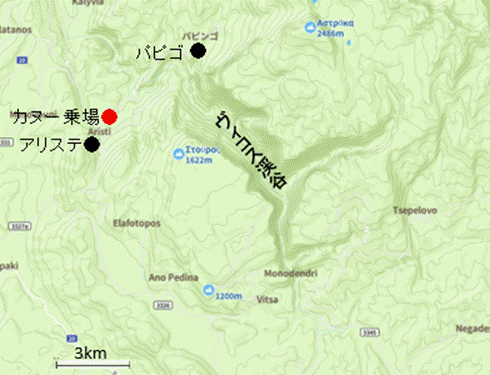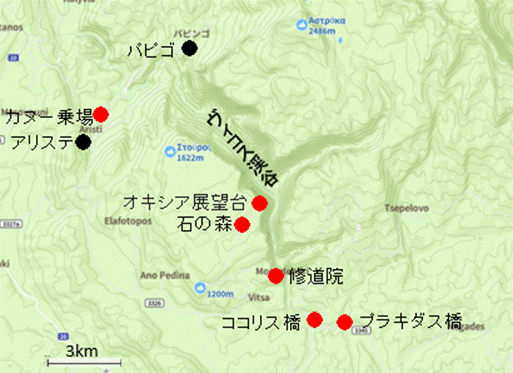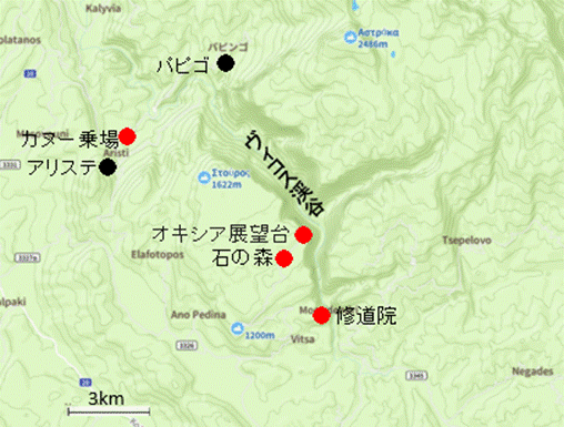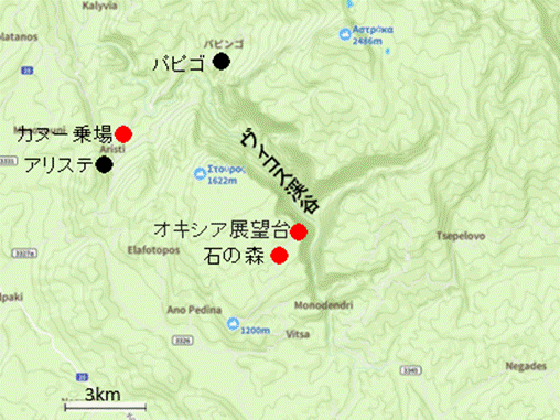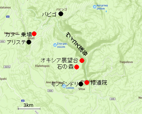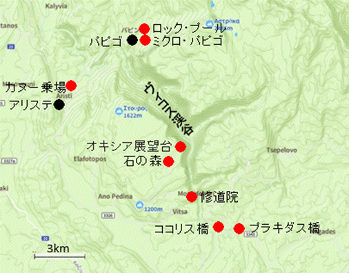 今日はパピゴの南にあるヴィコス渓谷に沿って花を探します。下の地図でもわかるように、ヴィコス渓谷はY字型にえぐれた深い渓谷で、パピゴは渓谷の一番北に位置します。赤丸が主に訪れた場所で、直線距離はそれほどでなくても、車ではパピゴからアリステ経由で大きく迂回するので時間がかかります。