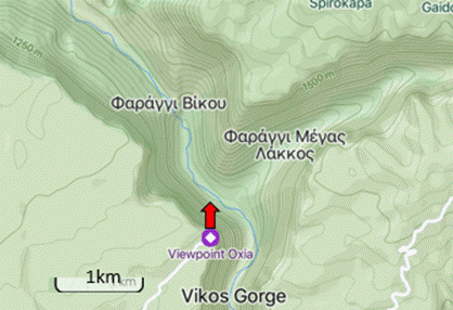 写真下中で谷底を流れているのがヴォイドマティス川(Voidomatis River)で、先ほど、私たちが下流でカヌーの船着き場を見た川です。ここはヴィコス渓谷がY字になっている分かれ目で、写真下は下地図のオキシア展望台(Viewpoint Oxya)から矢印の北に向かって撮った写真です。