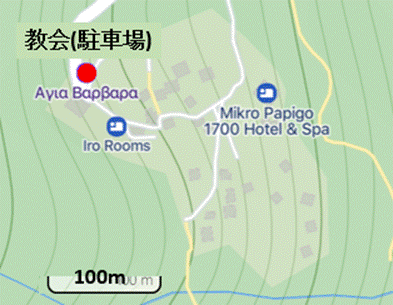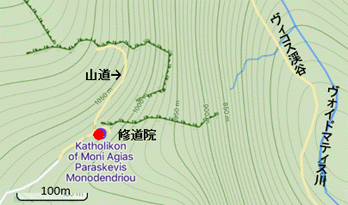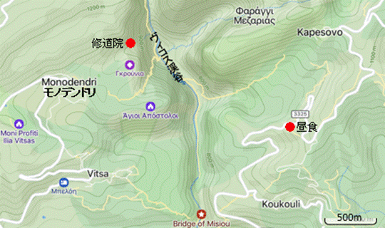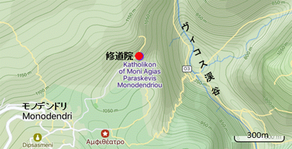 モノデンドリ ヴィコス渓谷に面した修道院があって、その近くで花を探します(地図下)。