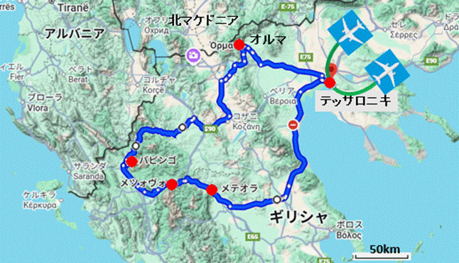 今回の旅行で3泊したパピゴが観光用に作ったホームページです。 「ギリシャの隠れた宝石「パピンゴ」へ」 「旅音(たびおと)」というブログで紹介された記事で、日本人の見たパピゴ(パピンゴ)の様子を知るのに役立ちました。 『地球の歩き方 ギリシアとエーゲ海の島々&キプロス2011』ダイヤモンド社、2010年 今回訪問した中ではメテオラが観光地なので参考になりました。 地図 旅行記の地図は主にGoogle、Mapcarta、Yahoo、Bing、OpenStreetMapの地図を加工して用いています。 日本との時差 ギリシャ -6時間(日本の午前11時はギリシャの午前5時、サマータイム) トルコ -6時間(日本の午前11時はトルコの午前5時) 為替 1ユーロ=163.28円(2025年4月25日、ネット上の為替相場) 1ユーロ=161.35円(2025年4月10日、東京の業者から現金のユーロを購入した時の為替相場) 1米ドル=143.76円(2025年4月25日、ネット上の為替相場) 名称と表記(順不同) ギリシャ、ギリシア、Greece、Ελλάδα、Hellenic Republic テッサロニキ、Thessaloniki、Θεσσαλονίκη メテオラ、Meteora、Μετέωρα ピンドス山脈, Pindus, Pindos, Pindhos、Πίνδος ピンドス国立公園、Pindos National Park メツォヴォ、Metsovo、Μέτσοβο カタラ山、Katara アオース湖、Aoos Lake パピゴ、Papigko、Papigo、パピンゴ、Papingo、Πάπιγκο メガロ・パピンゴ、Megalo Papingo、Μεγάλο