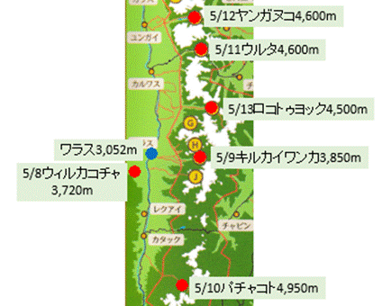 次の旅行まで3日間 昨年12月にこのツアーが発表された時、参加することにいくつか問題がありました。一つ目が日程で、私はこの旅行の直前にギリシャの花のツアーに参加して、帰国が5月4日(土)です。土曜日に帰国して水曜日に出発ですから、間がわずか3日しかありません。 しかも、ギリシャからの帰国は羽田空港で、スーツケースを4日(土)に自宅に宅配で送っても、運送会社によれば届くのは早くても6日(月)だという。もし、今回の旅行が羽田発着なら、スーツケースの発送が間に合わないので、参加は無理です。西遊旅行に問い合わせてみると、成田発着だというので、それなら車に乗せて行けますから、なんとかなりそうです。 同じような日程が2019年にもあって、キルギスから帰国して、間を3日空けて中国に行くという予定でした。ところが、キルギスから成田空港に帰国すると、客全員のスーツケースが出てこない!幸い、2日後に宅配便で届いたので、何とか次の旅行に間に合いましたが、心臓に悪い。今回はそんなこともなく、3日間で洗濯して今回の旅行に間に合わせました。 高山病 私には高山病も問題です。下図は今回の旅行で訪れる場所の標高です。数字を見ただけで、高山病になりそうです。私の場合、3000mをこえると高山病の初期症状が現れ始めます。ただし、その日の内に3000m以下に戻れば、頭痛やだるさなどの初期症状は出ても高山病そのものにはなりません。ところが、今回の旅行では、ホテルのあるワラスが標高3100mですから、ぎりぎりです。 酸素が不足して高山病になるのですから、酸素を吸えばいいのは、腹が減ったら飯を食えばいいのと同じです。そこでワラスで携帯用の酸素ボンベが売られていることを確認してもらい、ワラスで購入しました。