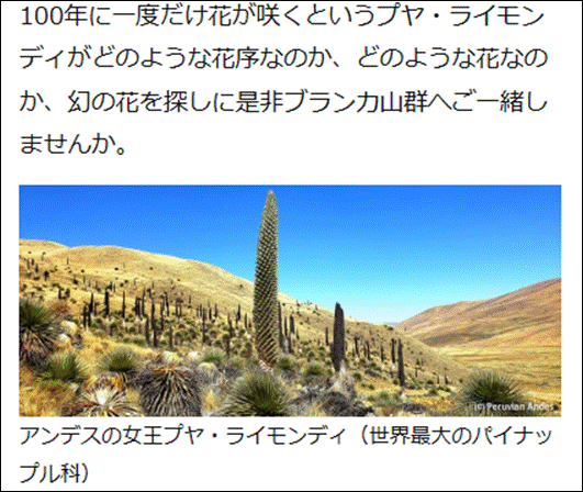 プヤの「花」は見られるのか? 昨年の12月上旬にこの旅行が新発表されて、申し込んだのは月末でした。スーツケースの件や高山病の問い合わせの他に、プヤという植物の花が見られるのかどうか、質問をしたので、現地の旅行会社に再度確認するなどで時間がかかったからです。 うるさい客のようですが、実際にはプヤはこの時期に咲いていないから、観られる可能性はほぼありません。ところが、募集要項には下のように、 「・・どのような花なのか、幻の花を探しに・・」 と、あたかも花が見られるかのような記述があったからです。探すも何も、咲く時期ではないのだから、花を見られる可能性はほぼゼロです。この点はとても重要というか、問題なので、後日も述べます。