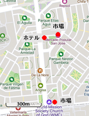 ホテルを出るとすぐ近くに、一つ目の小さな市場(Mercado Popular San Jose)を見つけました(写真下)。店の数は20~30軒というところでしょうか。野菜、果物の他に日常雑貨の店もあります。見て驚いたのはバナナで、写真下左だとわかりにくいが、とにかく大きくて、日本で買うバナナの倍はあります。