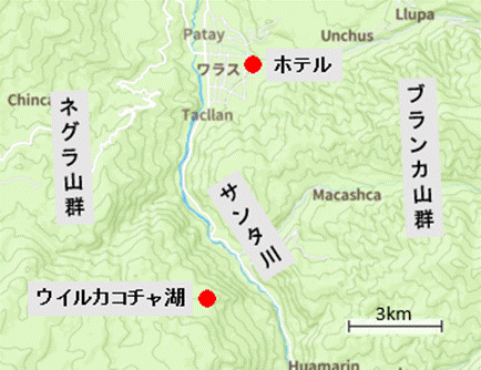 ovatus 湖はネグラ山群の東下がりの斜面にあるので、サンタ川をはさんだ東側のブランカ山群が借景になっています。ここからブランカ山群までつながっているのではなく、間にワラスなどの街があるサンタ川が流れています。