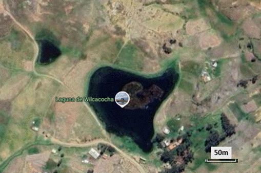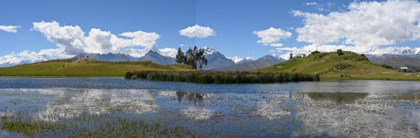 ウィルカコチャ湖 目的地のウィルカコチャ湖(Laguna de Willcacocha)に到着(写真下)。標高が3720mほどですから、富士山(3775m)の火口に水が貯まったようなものです。湖は風景がきれいなだけでなく、水草が生い茂り、水鳥がいて、水系が豊かです。写真下の真ん中に見えるのは湖の中にできた島で、たぶん水鳥の棲み処です。