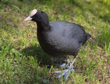 ここの水鳥は身体が黒、頭が白で(写真下左)、日本にもいるオオバンとそっくりです(写真下右)。生成AIによれば、アメリカオオバンだそうです。