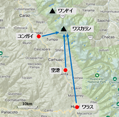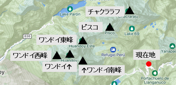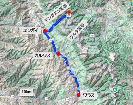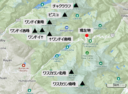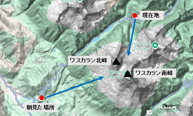 写真上と下で山の形が違うのは、空港やワラスは南から、ユンガイや今のいる所は西からワスカランを見ているからです(下地図)。