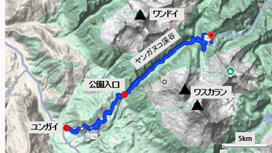 写真上 『ブランカ山脈 ワイワッシュ山脈』から転載 標高2,500mのユンガイから右(東)に曲がって、ヤンガヌコ渓谷の4,700mまで登ります。