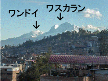先ほどマリア様が借景にしたのはワスカラン、飛行機で到着した5月8日に真っ先に目にした山がワスカラン(写真下左)、ホテルの食堂から毎朝、天気を確認する時に北側に見えるのがワスカランで(写真下右)、ワスカランの左奥に見えている山がワンドイです。