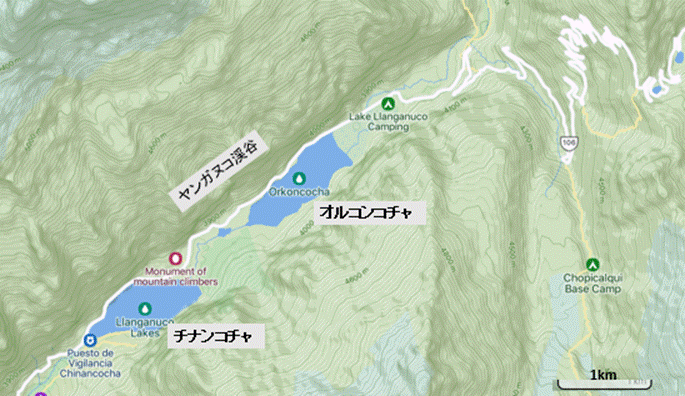 ヤンガヌコ渓谷には二つの湖があって、写真下が谷の手前にあるチナンコチャ(Chinan qucha、標高3850m)です。いかにも氷河が退却した後にできた氷河湖らしく、青緑色です。