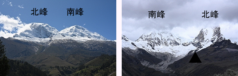 ブランカ山群の峰々 高度が上がるにつれて両側に見えてきたのが、ヤンガヌコ渓谷の南北にそびえたつワスカラン (写真下左)とワンドイ南峰(写真下右)です。