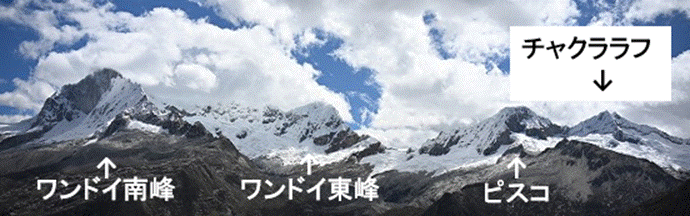 ワンドイ主峰(6,395 m)は南峰(6,160 m)と東峰(6,000 m)の間にありますから、今は雲がかかって見えません。そのさらに右側にはピスコ(Pisco、5,760 m)とチャクララフ(Chacraraju、6,112m)が見えます。