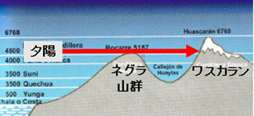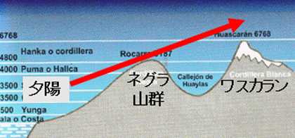 これは下の図のように、ネグラ山群が邪魔して、ワスカランに夕陽は当たらなくなったが、太陽はまだ出ているので上空は明るいからでしょう。ワスカランのあるブランカ山群とネグラ山群との位置関係と高さの微妙な違い、そしてワスカランが、夕陽が沈む海面とは6000m以上も差があるから生じた現象です。まあ、そんな説明はどうでも良く、ワスカランが日本から来た私たちのためにすごい夕焼けを見せてくれました。