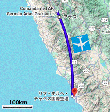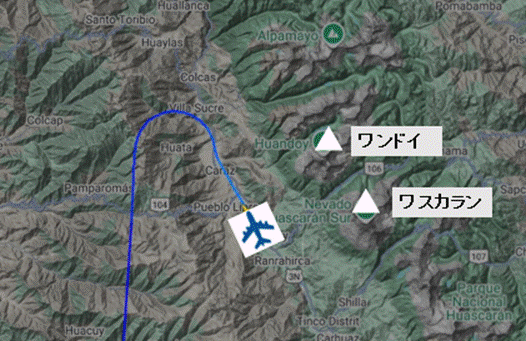 下図の青い線は実際のこの飛行機の飛行経路で、いったん北に行き、その後、南のリマに向かうので、東にあるブランカ山群を間近で見られるのは北に向かった時だけです。それで井瀬さんは右側の席を勧めました。