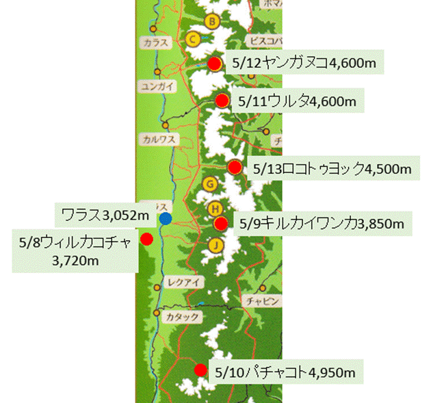 下の地図は、今回訪れた場所と、それぞれで私がいたおおよその最高高度です。